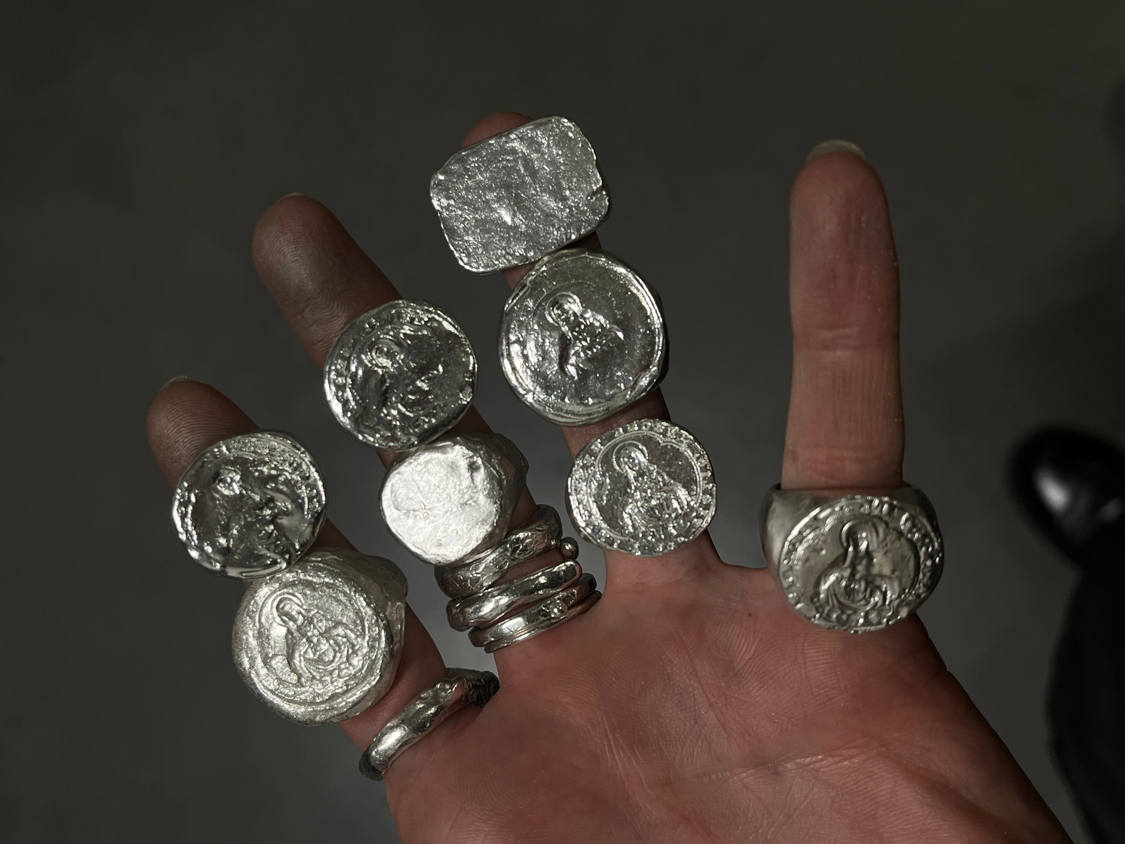 Most of my work is made with the lost wax casting technique by moulding wax into form. Other pieces are made with traditional metalsmithing techniques.